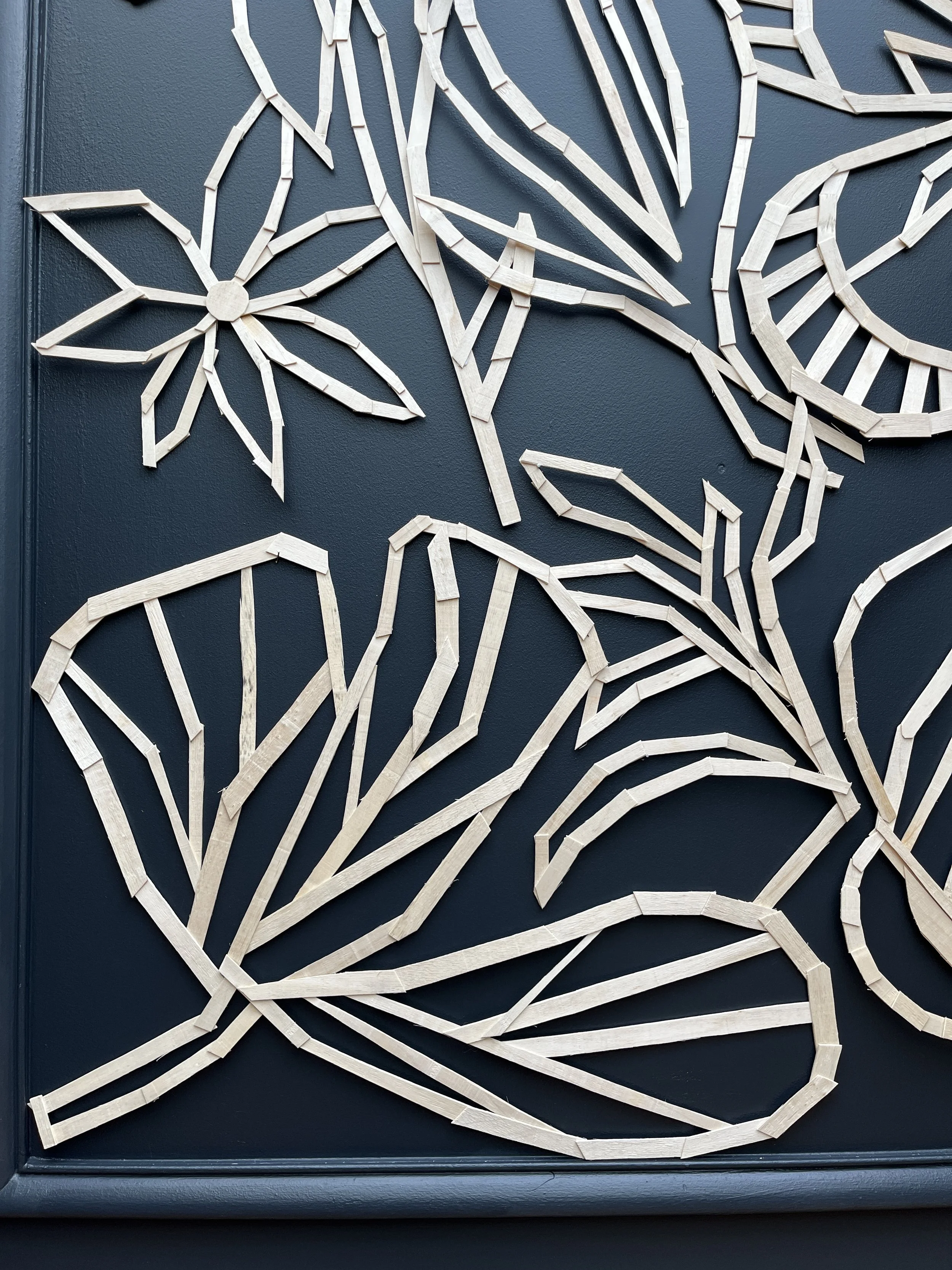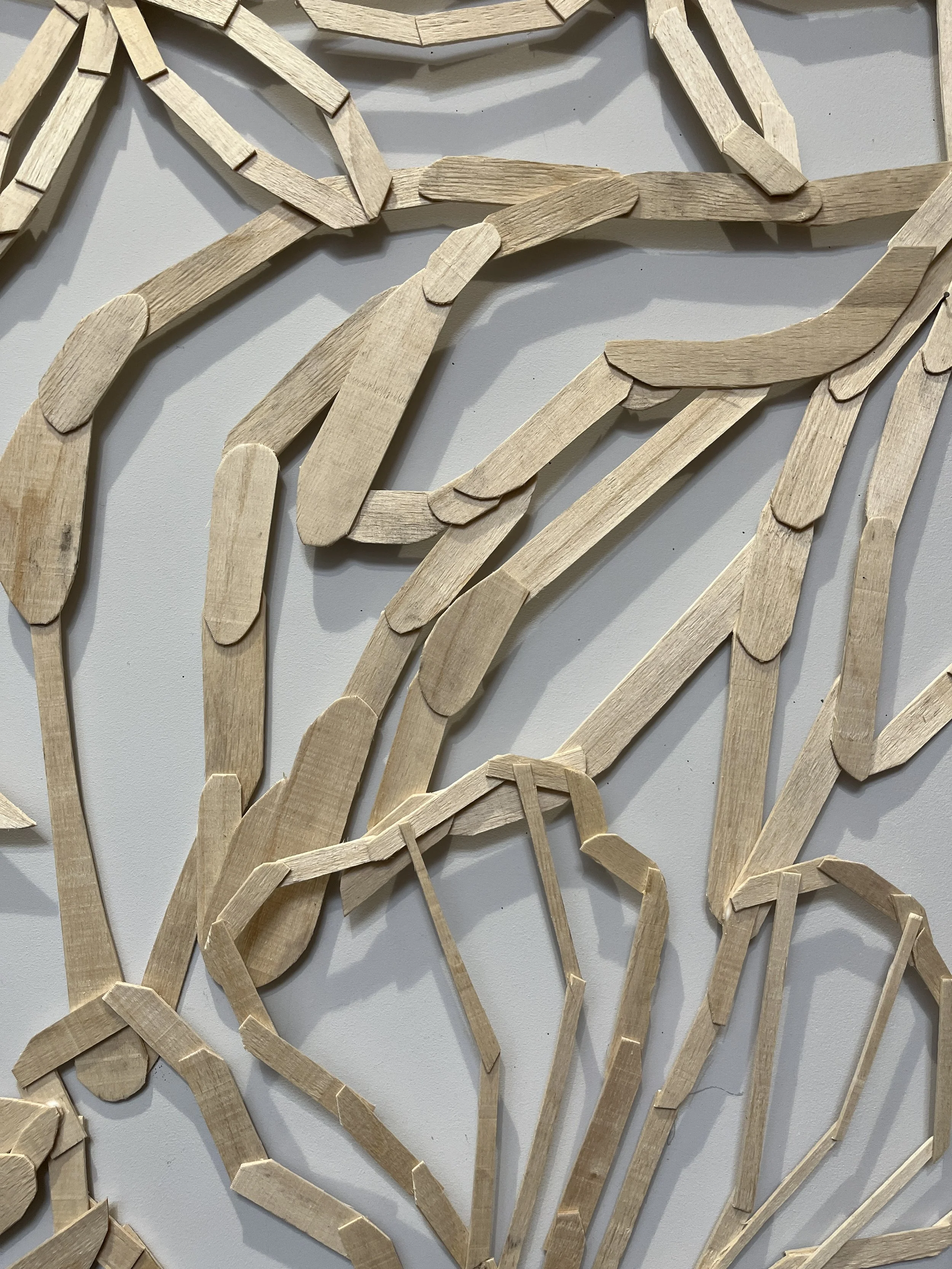 Bas relief en bois fait sur mesure brodé à la main pour le Parc Floral, Vincennes.